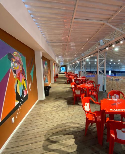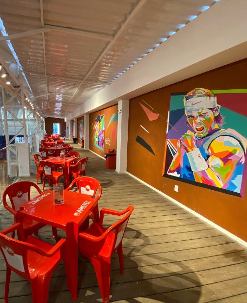 Nosso camarote é um espaço com vista panorâmica para as quadras de Tênis e de Pickleball, além de possuir incríveis pinturas de lendários jogadores de tênis. Tem capacidade para até 90 pessoas e pode ser utilizado em conjunto com a locação de alguma das quadras, ou de forma independente. Pedimos que entre em contato conosco para mais informações sobre organização, disponibilidade e valores para realização do seu evento.